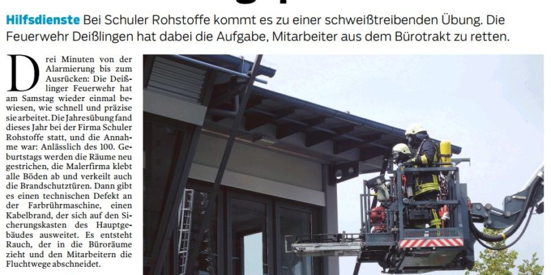 Die Ausgangslage für die Deißlinger und Lauffener Floriansjünger: Aufgrund des 100. Jubiläums ließ die Firma Schuler Rohstoff GmbH ihre Büroräume neu streichen. Hierfür klebte die Malerfirma sämtliche Böden ab und verkeilte hierdurch auch die Brandschutztüren.