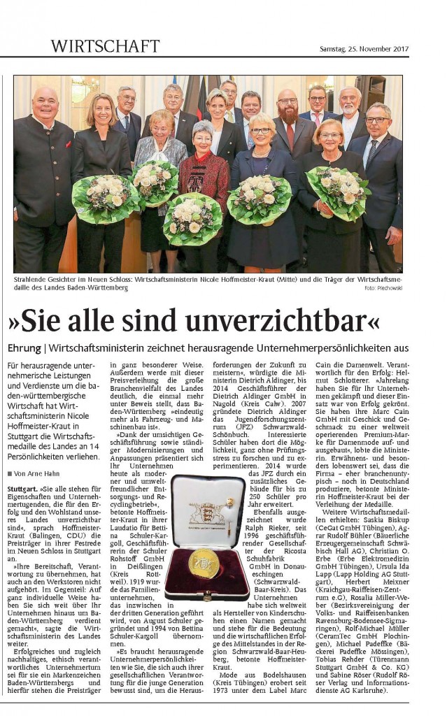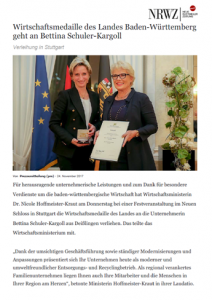 Für herausragende unternehmerische Leistungen und zum Dank für besondere Verdienste um die baden-württembergische Wirtschaft hat Wirtschaftsministerin Dr. Nicole Hoffmeister-Kraut am Donnerstag bei einer Festveranstaltung im Neuen Schloss in Stuttgart die Wirtschaftsmedaille des Landes an die Unternehmerin Bettina Schuler-Kargoll aus Deisslingen verliehen. …