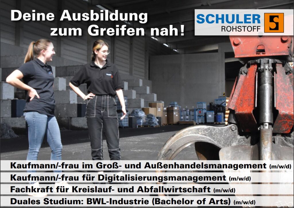 Ob Kaufmann/-Frau im Groß- und Außenhandelsmanagement (m/w/d) oder Fachkraft für Kreislauf- und Abfallwirtschaft (m/w/d) – SCHULER ROHSTOFF bietet Dir nicht nur eine qualifizierte und praxisnahe Berufsausbildung, sondern hier lernst Du einen Beruf mit Zukunft und Verantwortung.